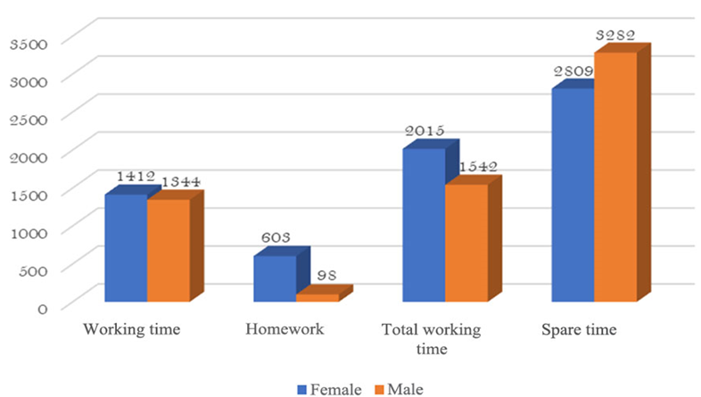 In light of this fact, women must effectively manage their time to achieve a balance between their domestic and professional responsibilities (Pesik, Baroleh, & Kaunang, 2016). Figure 1 depicts the allocation of time working for a living, doing housework, total working time, and leisure time for female and male farmers in Songan village, Kintamani district, Bangli regency.