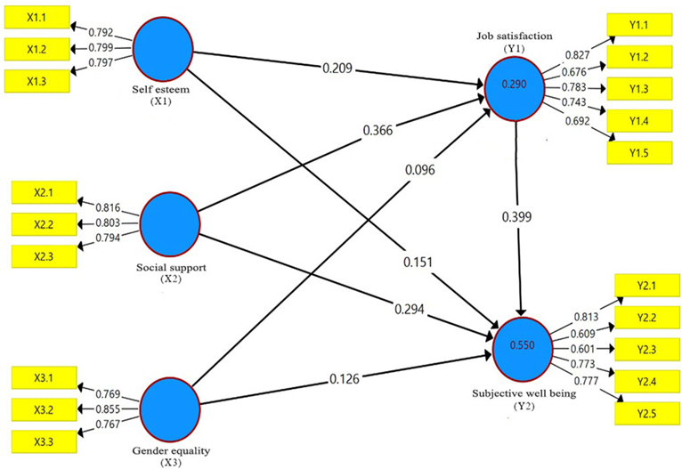 This study aimed to determine how female farmers in Songan Village allocate their time to earn a living and to interpret the contribution of self-esteem, social support, gender equality, and job satisfaction to their subjective well-being. The study employed an explanatory research design and structural equation modeling (SEM) analysis. As an alternative to covariance-based SEM, variance- or component-based SEM, namely the partial least squares (PLS) method, was utilized. The research sample consisted of 201 respondents selected through proportional random sampling. The study found that 1) self-esteem and social support have a direct positive effect on the job satisfaction of female farmers in Songan Village, Bali, but the gender equality variable does not; 2) self-esteem, social support, gender equality, and job satisfaction have a direct positive effect on the subjective welfare of female farmers in Songan Village, Bali; and 3) self-esteem and social support have an indirect effect on the subjective welfare of female farmers in Songan Village, Bali. The female farmers of Songan Village define subjective happiness/well-being in simple terms, asserting that if they are able to meet the needs of their families (meyadnya and menyame braye), they are already happy/have achieved subjective well-being. Women with high self-esteem feel confident that they contribute a significant portion of the family's income. Therefore, the government should pay more attention to the development of women's knowledge and skills, particularly in the agricultural sector.