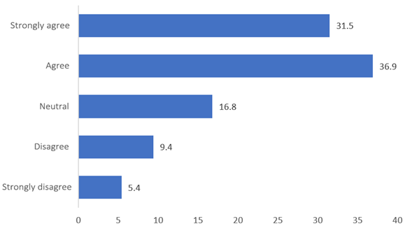 Table 2 presents the results of AI support in improving employee engagement in the company. From an analysis of the sample population's responses, it can be observed that 36.9% of respondents agreed with the statement, 31.5% strongly agreed with the statement, 16.8% were neutral, and the remaining respondents disagreed or strongly disagreed (Table 2).