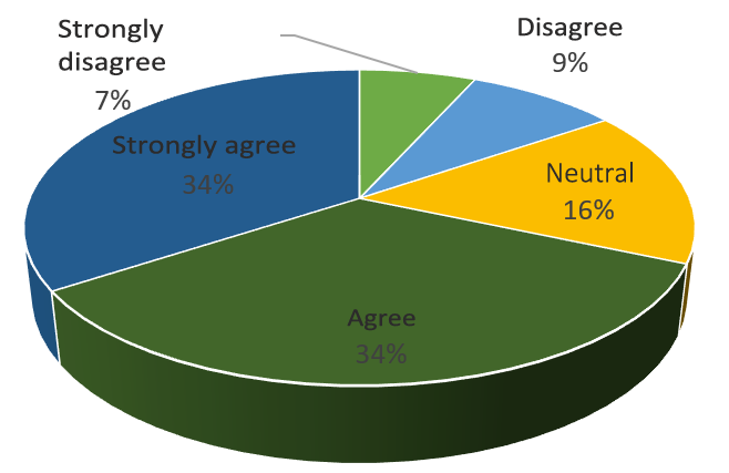 The results in Table 3 show that 68.4% of the respondents agreed or strongly agreed with the statement that AI reduces employee turnover. On the other hand, 16.1% were neutral, and the remaining respondents disagreed or strongly disagreed with the statement. The pie chart in Figure 2 illustrates the results.