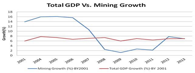 Linking mining with other sectors of economy is very crucial. Linking mining to other sectors of the economy provide both backward and forward linkages in mineral value chain (Sigam and Garcia, 2012). Mining needs inputs tangible and intangible supplies, such goods include equipment, production reagents, grinding media, fuel and foodstuff. Intangible supplies include technical services, financial services, cleaning and catering services. On the other end, forward linkages include mineral based manufacturing, refinery, lapidary, jewelry, financial and marketing services (Vorster, 2001).Figure-1. Total GDP vs. Mining Growth (%) (2001-2013)