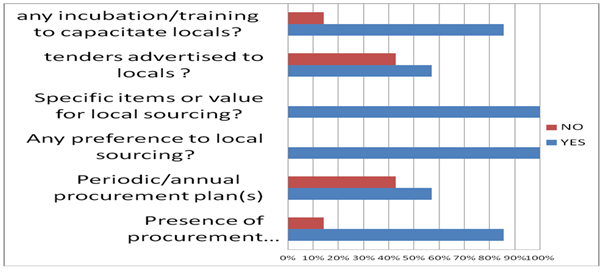 The survey also noted that there have been no commitments towards local sourcing beyond corporate social responsibility. Measurements of commitment towards local sourcing noted serious gaps including absence of budget along with procurement plan for local sourcing; lack of step-by-step procedures in giving preference local suppliers or service providers in tendering process; only limited items (particularly catering/foods) reserved for local suppliers and service providers; Tender notices and information about supply opportunities are not broadly advertised to National Suppliers through popular channels ; Inadequate initiatives to facilitate local suppliers with samples and advance payments (Figure 9).