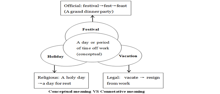 The same word has diverse connotative meanings in different language, and specific cultural connotation in the given culture. English has a large and rich vocabulary, among which many words, after experiencing the transition of old English, medieval English and modern English, carry various cultural information, i.e. political philosophy, historical geography, religious legend, literature, art and so on. The variety of diction is significantly demanded in English writing, and it is embodied in alternative using of synonyms. Therefore, English writing teaching can begin with delicate shades of meaning among synonyms to instruct students to comprehend the cultural connotation of words and to pay attention to the cultural color of words in hope of achieving precise diction. Take a set of synonyms like “holiday”, “vacation”, and “festival” used in the sample writing above for example. Although the three words frequently used words in English writing are similar in basic meaning, their cultural connotation are varied in term of lexical origins, which is shown in the following graph.