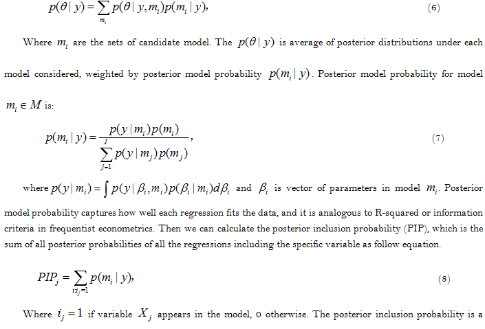 However, there are 32 control variables in multivariate meta-regression, and it is usually not clear that which control variable matters. According to Moral-Benito (2015) researcher’s uncertainty about the value of the estimates of interest includes two levels: the first one is uncertainty associated with the estimate conditional on a given model, which is assessed in each empirical study; the second one is uncertainty with the specification of the empirical model (model uncertainty), which is not fully assessed. Researchers typically get their conclusions from the “appropriate” model based on their subjective choose. However, the conclusions may be sensitive to selected model. In order to address above regression model uncertainty, we employ Bayesian model averaging (BMA) in Equation 5. BMA is an attractive technique to account for model uncertainty, and it has been widely applied in economics (Doppelhofer and Miller, 2004; Tobias and Li, 2004; Blonigen and Piger, 2014) and the field of meta-analysis (Moeltner and Woodward, 2009; Havranek et al., 2015). The basic idea of Bayesian model averaging is to regress model with many different subsets of control variables and make inferences based on a weighted average over model regression. In brief, BMA marginalizes over models to derive posterior densities on model parameters that account for model uncertainty, as follows: