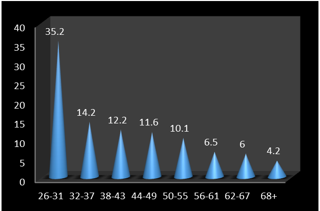 According to Figure 1 above, 35.2% of the respondents fell within the age categories of 26-31 years, 14.2% were aged between 32-37, 12.2 were aged between 38-43 years; 11.6%, 10.1% & 6.5% were aged between 44-49, 50-55 & 56-61 respectively while, 6% and 4.2% were aged between 62-67 and 68+ respectively. The table revealed that majority of the respondents were in the age category of 26-31 years.