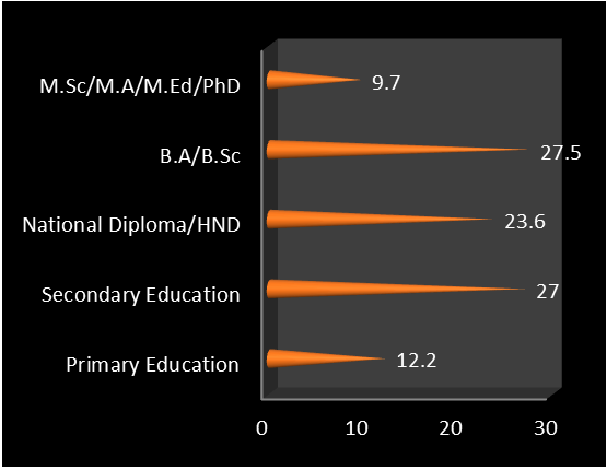 Figure 2 above shows that among the respondents sampled, 27.5% possessed Bachelor of Arts (B. A) and B.Sc. (Bachelor of Science) degrees and 23.6% had a National Diploma or a Higher National Diploma Certificate. 27% of the respondents had a Secondary Education certificate, and 12.2% and 9.7% possessed a primary education certificate and M.Sc. and above respectively.