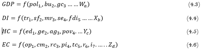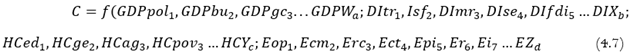 C depicts corruption as a function of the independent factor (Y). Based on the literature, the elements of vector Y are grouped into four major variables: economic growth (GDP), human capital (HC), domestic investment (DI), and the entrepreneurial ecosystem (EC); hence, Equation 4.2: