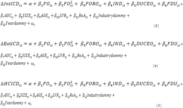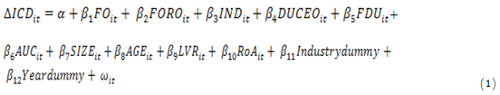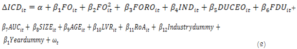 To measure corporate governance, family ownership (FO), foreign ownership (FORO), board independence (BIND), CEO duality (DUCEO), family duality (FDU), and audit committee (AUC) were incorporated into the proposed model, along with several control variables, as indicated by Equation 1 namely firms size (SIZE), firm age (AGE), degree of leverage (LEV), and return on assets (ROA). In the present study, a quadratic specification of FOWN variable was adopted, since a non-linear relationship between family ownership and the extent of ICD is hypothesized. The rationale behind using firm size as the control variable is that, unlike small or medium-sized firms, large-sized firms can disclose more voluntary information in order to mitigate the conflict between the managers and shareholders. Likewise, long-established firms have developed reputation over time and would thus be more likely to voluntarily disclose information to support their standing in the market. Further, firms with high leverage have a higher external pressure from creditors and other stakeholders, and will thus typically disclose more voluntarily information (Arvidsson, 2003). Lastly, highly profitable companies tend to disclose more information as this enhances their market reputation (Ousama et al., 2012).