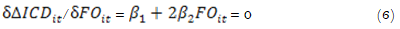 In order to ascertain whether the hypothesis of non-linear effect of family ownership (FO) on IC disclosure (ICD) is supported, Equation 2 is estimated and the significance of the coefficients of the linear and squared terms is assessed. If both coefficients are significantly different from zero, the peak of the quadratic function can be determined, thus revealing the critical point above which the marginal impact of family ownership on ICD is negative. To calculate the critical point corresponding to the FO threshold level, the partial derivative of Equation 2 is computed with respect to FO. The derivative yields Equation 6 below, which is set equal to zero: