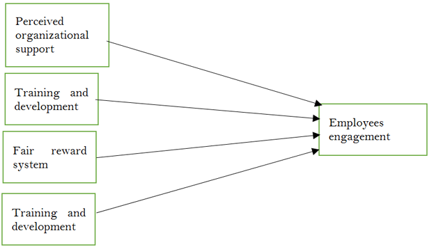 Based on the literature review, this study proposed and empirically tested the theoretical framework in Figure 1. Therefore, Figure 1 explains that training and development, a fair rewards system, information sharing and perceived organizational support positively influence employee engagement.