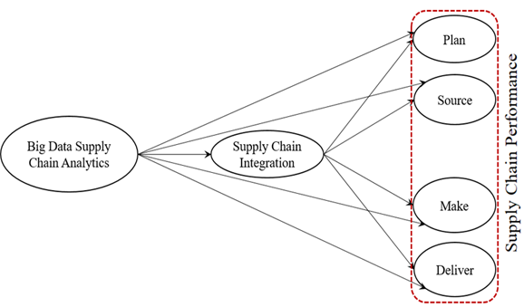 Supply chain integration brings supply chain players together by improving communication, and flow of information. Improved flow of information, communication and better understanding of the counterparts are some of the key traits of supply chain integrations. The presence of these elements at the three interfaces of a business entails real supply chain integration. These interfaces are internal focused, suppliers focused and customer focused. Internal integration represents the integration of various departments of organizations to perform business transactions. It also takes into account the integration of supply chain department with rest of the departments of the departments of the organization. The supplier integration represents the improved flow of communication, collaboration and connectedness with major suppliers. Likewise, the customer integration represents the effective flow of communication, products, services, and funds with the customers. It also takes into account the level understanding, cooperation, trust and loyalty between organization and its customers. Putting together, supply chain integration reflects an effective communication, higher degree of trust and collaborativeness, timely sharing of right information and concern for other parties at the level of suppliers, customers and intra-organization. Both practitioners and theorists agree that supply chain integration acts as lynchpin between the various development aim to improve the supply chain and supply chain performance itself. Specifically, supply chain integration acts as a mediator in the relationship between big data supply chain analytics and supply chain performance (Mubarik et al., 2018). They argue that incorporation of modern technologies like big data in the supply chain significantly improves the integration of supply chain bringing various players together and sharing the real tie information. It further improves the performance of various functions of supply chain. Similarly, Gunasekaran et al. (2017) and Mubarik et al. (2019) argue that big data analytics in supply chain results in higher integration of supply chain. They further argue that supply chain integration can have a significant momentous effect on the planning function of supply chain. Adding to Gunasekaran et al. (2017), Mubarik et al. (2018) argue that adopting BDSCA not only improves the supply chain integration but it also have direct impact on the supply chain performance. They further explain that supply chain integration affect all four pillars functions of supply chain i.e. plan, source, make, and deliver. Against this backdrop we hypotheses followings: