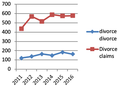 Based on data from the Religious Court office, the reasons for the breakdown of the marriage were divorces and lawsuits. While the lawsuit is his wife or lawyer suing her husband in the Religious Court, both are called divorce. The following are data on the number of divorces and lawsuits in the past six years (2011-2016):
