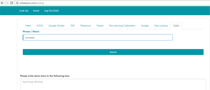 To scaffold participants in writing, a website named Onlineconc was designed and developed. The researchers featured four concordancing resources, namely the Corpus of Contemporary American English (COCA), JTW, Flax learning collocation, and Frazeit. Google and Google Scholar were included as search engines. Four kinds of online dictionaries such as Ozdic.com, Bilingual and monolingual dictionaries, and Thesaurus were also featured in each tab on Onlineconc.