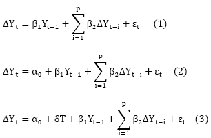 The ADF unit root models are based on the conditions of the model without both the constant and time trend for equation 1, the model with only the constant for equation 2, and the model with both the constant and time trend for equation 3.