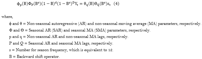 ϕ, θ, Φ, and Θ denote the estimated parameters of AR(p), MA(q), SAR(P), and SMA(Q) respectively.