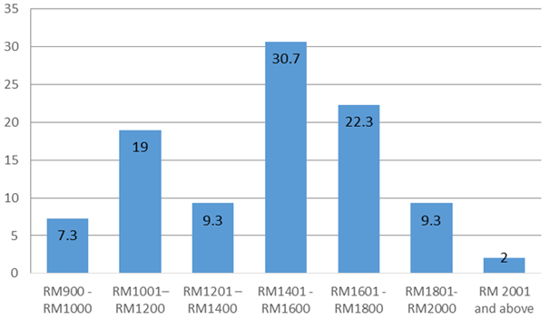 Monthly income is found to be a strong determinant of health and access to services (Lee et al., 2014). Lee et al. (2014) also found a strong association between higher salary and visits to a doctor within three months. Differences in income level affect the degree of utilization. Figure 3 deals with the overall level of monthly income of Bangladeshi migrant workers in Malaysia. Though the government of Malaysia has fixed foreign workers’ minimum salary at RM900 per month, construction, manufacturing and service sector migrants receive a different amount based on the type of job and hours of overtime (Ullah, 2011). The present study identifies seven categories of monthly income ranging from RM900 to RM2001, which respondents under study usually earn. Figure 3 indicates that the majority (30.7%) earn RM1401-1600, 22.3% of the respondents earn RM1601-1800, 19% earn RM1001-1200, and 7.3% earn RM900-1000. It is noteworthy that 9.3% of migrant workers earn RM1201-1400 and a similar percentage earn from RM1801-2000, with only 2% earning RM2000 and above.