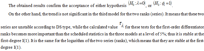 We will then show that these variables are non-stationary. According to this assumption, the long-term study of their relationship poses a problem that the regression we get is often false. These results corroborate with those of Granger and Newbold (1974), and in this case, we opted to use the cointegration test, which was originally developed by Granger, C. W. J (Granger, 1981).