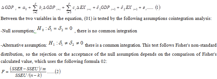 From Table 2, we observe that the EX and GDP variables are determined as I(1) according to the ADF and PP test. It is noteworthy that the value of the calculated statistics for the ADF and PP tests is inferior to the scheduled statistics in the three models at a level of 5%.