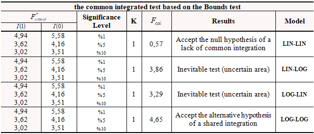 Note: It is obvious from the table that the calculated F statistics are greater than the upper critical value displayed in the last model. In this respect, hypothesis H0 is rejected, and the existence of a cointegration relationship between the variables can be concluded.