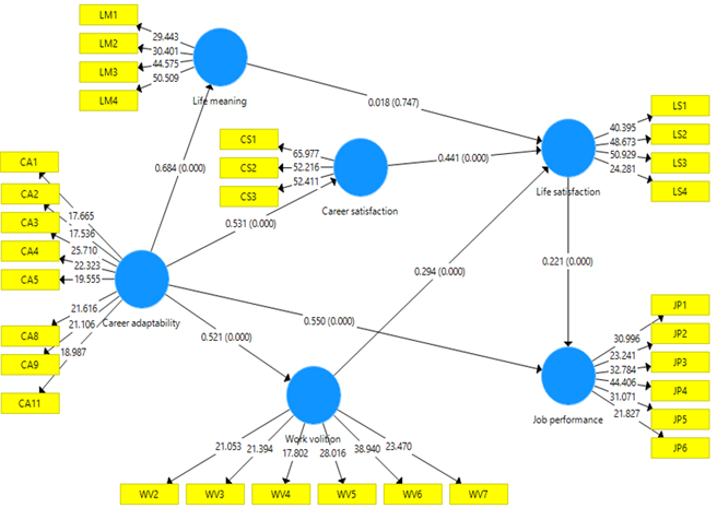 The hypotheses were examined using a structural equation modeling (SEM). SEM is a statistical approach for testing cause–effect relationships that reflect multiple equations. In addition, the partial least squares SEM (PLS-SEM) approach is highly suitable for examining a complex model with many simultaneous relationships. It is used in development in business research, marketing, economic management, and many other social sciences. This study mainly focuses on identifying the impact of career adaptability, life meaning, career satisfaction, and work volition on life satisfaction and job performance. Therefore, the PLS-SEM method is appropriate for testing our research hypotheses (Gefen, Straub, & Boudreau, 2000; Peng & Lai, 2012). Moreover, considering the absence of distributional assumptions in some social science studies, the use of PLS-SEM is clearly an advantage (Hair, Risher, Sarstedt, & Ringle, 2019).
