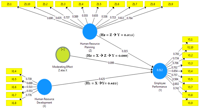 The results of the hypothesis bootstrapping test analysis show that human resource development has an effect on the performance of employees in the South Sumatra regional division, which means that it is in accordance with the first hypothesis that the development of resources on the performance employees; second, it can be interpreted that human resource planning (Z) affects the performance of the employees, which means that it is in accordance with the hypothesis that human resource planning affects the performance of the Perum Bulog employees; and third, it can be interpreted that that human resource planning is not a moderating variable for the development of human resources on the performance of employees at Perum Bulog. It is expected that Ho is rejected and Ha is accepted, or SmartPLS has a sig. value of < 0.05.