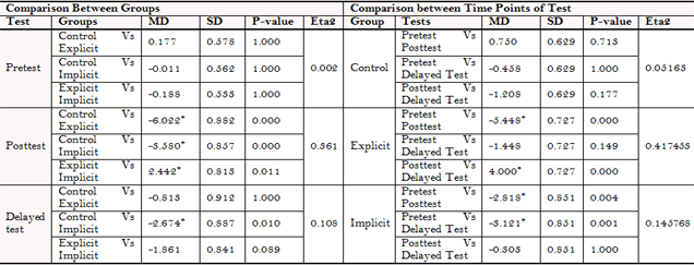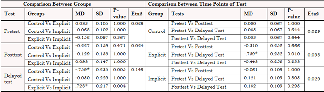 In order to answer the research question, it was important to ensure that there was no significant difference between the three groups across the main eight apology-specific strategies in the pretest. Hence, a one-way ANOVA was run for the pretests and the results confirmed that there were no significant differences among the three groups in the pretest across the eight strategies (i.e., F = 0.074 and P = 0.929 for an expression of apology; F = 0.773 and P = 0.465 for an explanation or account of the situation; F = 0.315 and P = 0.731 for an acknowledgement of responsibility; F = 1.930 and P = 0.152 for an offer of repair; F = 0.823 and P = 0.443 for a promise of forbearance; F = 1.103 and P = 0.337 for no response or apology; F = 1.138 and P = 0.325 for a denial for the need to apologize; F = 1.218 and P = 0.301 for a denial of responsibility). These results allow us to safely assume that the differences in the posttest and the delayed posttest reflect the effect of the treatment.