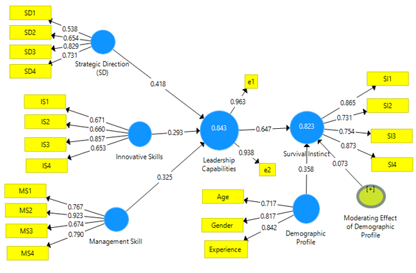 Four hypotheses were formulated for this study and the constructs were carefully selected. The first hypothesis focuses on the influence of strategic direction on the survival instincts of faith-based organizations. The leadership capabilities and survival instinct were measured with four items, as depicted in Table 1. The second hypothesis concentrates on the effect of innovative skills on the survival instincts of faith-based organizations. Innovative skills was measured with four items. The third hypothesis tested the influence of management skills on the survival instincts of faith-based organizations, and each construct was measured with four items. The fourth hypothesis looked at the moderating role of the demographic profile of the respondents on the relationship between leadership capabilities and survival instincts of the faith-based organizations. R-squared, t-statistic values, and p-values are critical indicators in SmartPLS that are used for the determination and interpretation of the results, as portrayed in Figures 1 – 3.