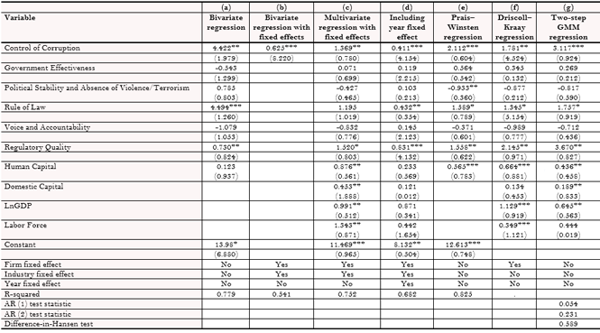 To ensure the robustness of our main regression results, we ran various regression techniques, including the generalized method of moments. The results shown in Table 2 confirm that the significant relationships for the above three variables remain positively significant and consistent for all the different measures from column “a” to column “g”. This endorses the robustness of our baseline results.