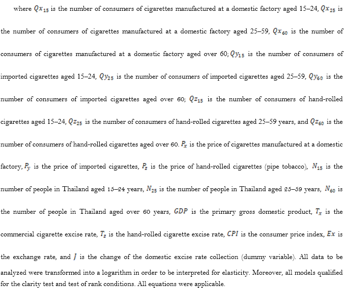 The number of consumers of each type of cigarette and age range was gathered from the documents of the National Statistical Office (2004); National Statistical Office (2007); National Statistical Office (2014); and National Statistical Office (2017), whereas the data on prices of domestic and imported cigarettes were gathered from the notification of the Excise Department (1989 to 2019).