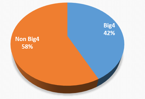 Table 1 presents the descriptive statistics in this regression model. With a mean value of -0.23771, or -23.77%, it explains that the earnings quality of the unit of analysis is quite good with low manipulation of earnings in published financial information. With a mean value of -0.01246, or -1.24%, it explains that the average value of moderation between financial performance and earnings quality in the unit of analysis is quite high because the company's financial performance information is minimal from earnings manipulation using discretionary accruals, and a mean value of 0.05197 explains that the average value of moderation between financial performance and audit quality in the unit of analysis is quite high because the company's financial performance information has been audited by good quality auditors. The closing share price of the entity on the publication date of the financial statements is very far apart, namely between IDR 50 to IDR 111,400. Figure 1 explains that 42% of units were audited by one of the big four and the rest were audited by a non-big four company.
