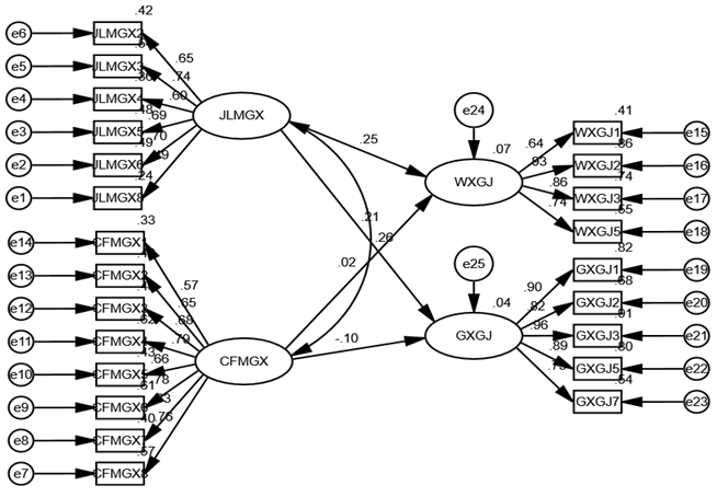 With the analysis of the path regression coefficient (see Table 7), the P-value of the influence of reward sensitivity (JLMGX) on overt aggression (WXGJ) is less than the 0.05 significance level, so this study considers reward sensitivity (JLMGX) as influential on overt aggression (WXGJ); the P-value of the influence of reward sensitivity (JLMGX) on relational aggression (GXGJ) is less than the 0.05 significance level, so we conclude that reward sensitivity (JLMGX) has an influence on relational aggression (GXGJ); the P-value of the influence of punishment sensitivity (CFMGX) on overt aggression (WXGJ) is greater than the significance level of 0.05, so we can confirm that punishment sensitivity (CFMGX) does not have influence on overt aggression (WXGJ); and finally, the P-value of the influence of punishment sensitivity (CFMGX) on relational aggression (GXGJ) is greater than the significance level of 0.05, so we can conclude that punishment sensitivity (CFMGX) does not have influence on relational aggression (GXGJ).