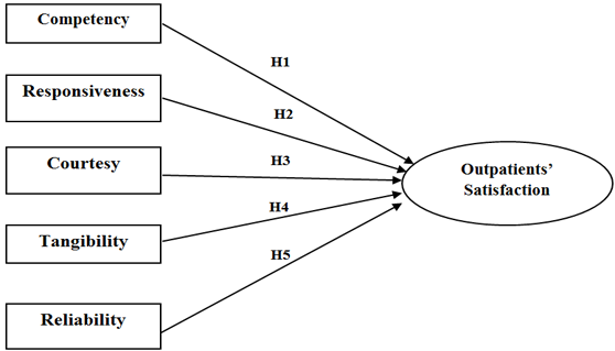 Outpatient satisfaction = 0.1650 + 0.2553 (Competence) +0.0260 (Responsiveness) + 0.0830 (Courtesy) + 0.3076 (Tangibility) + 0.2685 (Reliability).
