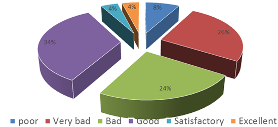Figure 1 describes that highest number among the respondent (34%) measure that the staff and nurses behavior towards patient is very good where 26% think very bad and 24% states the service quality of nurses and kinds of stuff have quite bad. Only 8% are satisfied.