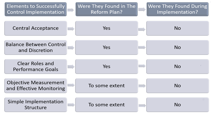 The findings of this research are presented in Figure 1 seen above and will be further examined in the discussion below in order to determine how the tools used by the central government to control implementing bodies can impact the success of a reform’s implementation.