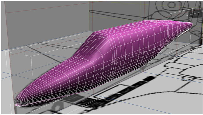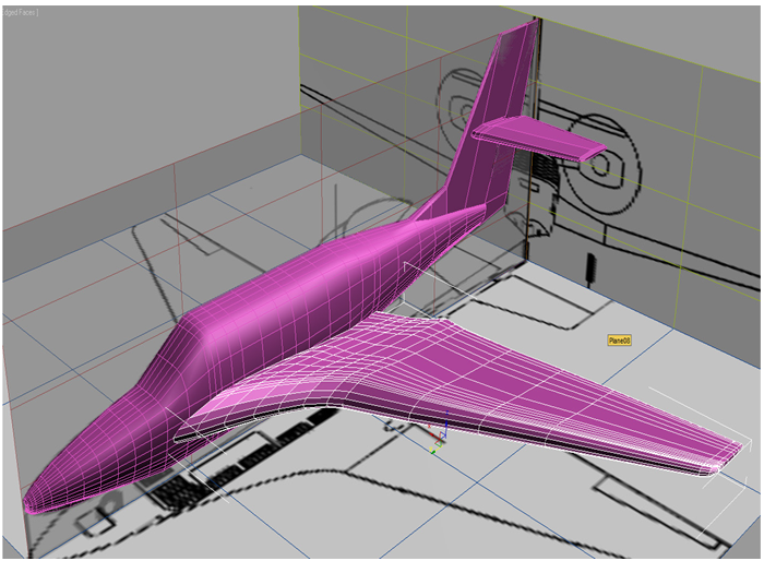 At the next stage we will replicate the contours of the aircraft body (see Fig. 6) applying he method of sequential extrusion to the group of polygons and subsequent projections alignment, While increasing the number of polygons moving along the body axis, must be collate the extrusion process with aircraft projections in all three planes.