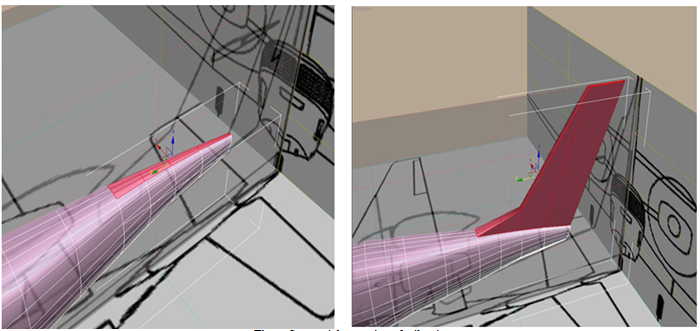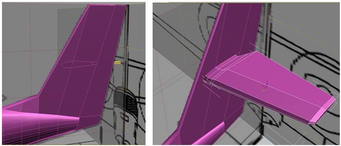 Before selecting a number of polygons in the tail unit, it is required to review the aircraft projection from above (see Fig. 8, on the left). These polygons will be used as initial ones to make the vertical tail plane of future aircraft. The vertical plane consists of two main components, the leading and trailing edge and it is a rudder at the same time. The tail unit is simulated with use of polygonal extrusion method according to aircraft projections (Fig. 8). Cut the horizontal stabilizer mounting socket contour in the certain point of the tail unit plane with Cut tool (see Fig. 9). Then can be started sequential polygon extrusion, the result is shown in Fig. 9.