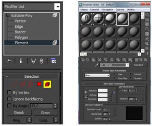 Materials to be assigned for different body parts at the Element sublevel of Editable Poly object (Fig. 15, on the left). Elements are selected one-by-one and assigned the previously made and adjusted materials with Editor Material tool (Fig. 15, on the right).