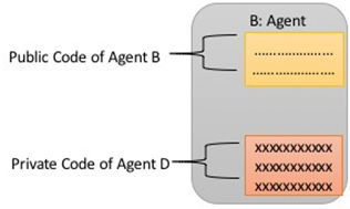 The Static Mutual Protection strategy can be successfully applied to many different scenarios. However, there are scenarios where it is not possible to foresee the potential interactions between the agents; where the agents are generated by different parts, or involve very dynamic multi-hop agents. In these cases, the Static Mutual Protection strategy will be difficult or impossible to apply. In the Dynamic Protection Strategy each agent is able to execute arbitrary code sections on behalf of other agents in the society. As shown on top of figure 11, each agent includes a public part, an encrypted private part and a specific virtual machine similar to the one described in Maña, et al. [6]. This virtual machine allows agents to execute on-the- fly code sections (corresponding to the private parts) received from other agents.