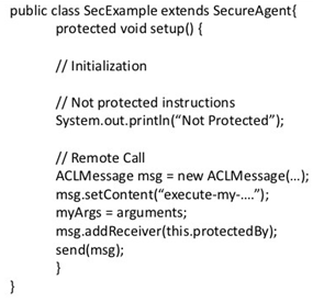 The class that illustrates the figure ExampleCode shows non protected agent source code, which inherits from Agent class and its execution code is inside the setup() method.