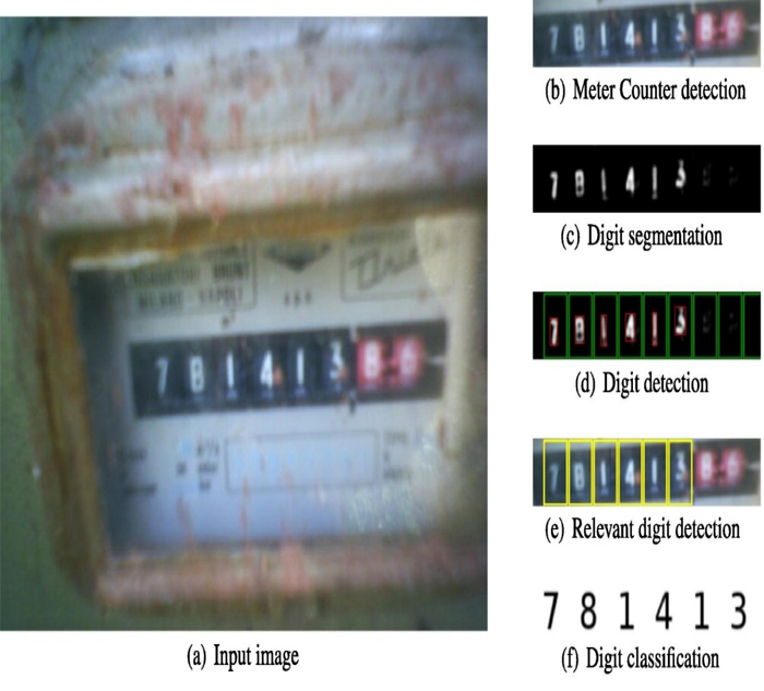 Vanetti, et al. [11] present a novel approach for automatic gas meter reading from the real world images. Like electricity meter reading, the gas meter reading is usually done manually by an operator, and a picture is taken from a mobile device as proof of reading. Since the reading operation is prone to errors, the proof image is checked offline by another operator to confirm the reading. The Figure 3 shows the results of various stages obtained by Vanetti, et al. [11].