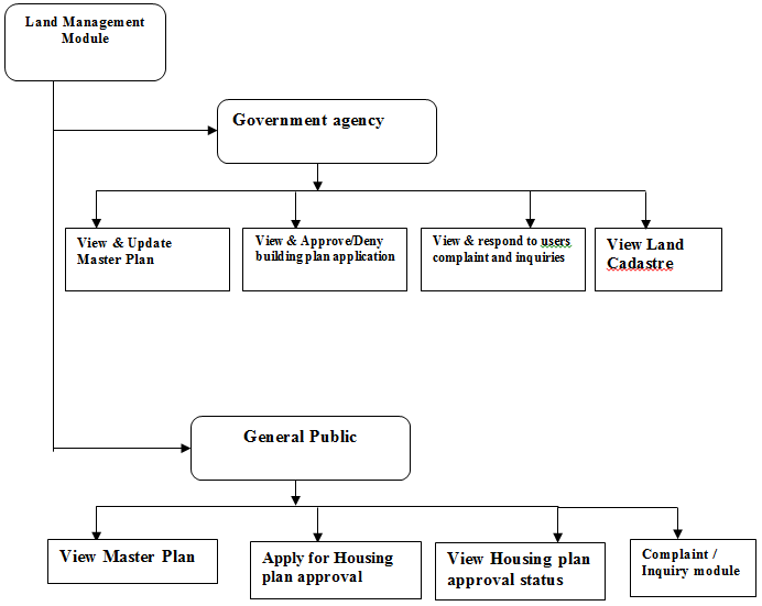 The land management module: The land management module, as shown in Figure 4 provides the Government housing administration agency with the tools to map and visualize the master plan for a city with detailed information about areas earmarked for different purposes such as market, industries, banking, stadia, parks, etc. It also provides the land registration office the details of properties any area. Furthermore, the public can also lay complaints or make inquiries about housing plans through this module. Also, the module provides an avenue for people to apply for approval of housing plans which are viewed and given due consideration by the agency concern.