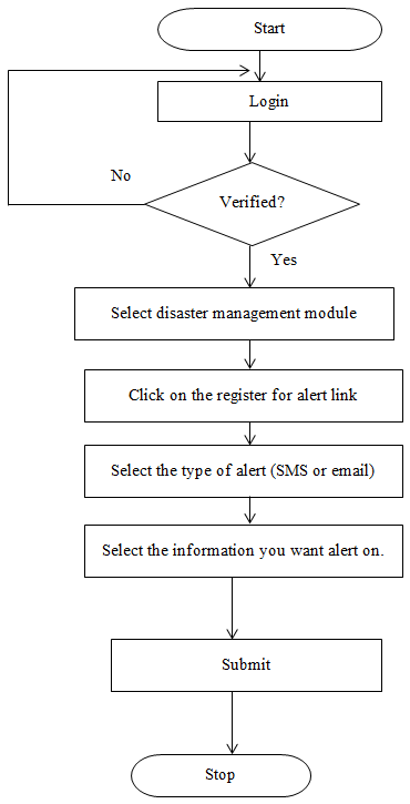 The flowchart in Figure 12 shows the process entailed in registering for alert by a user. A user can register to be alerted for a specific type of disaster situation and can also choose to be alerted either through SMS or Email.