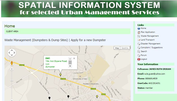 The screenshot in Figure 17 shows mapping of dumpster in an area from the user’s page, for a user searching. The user can also apply for dumpster in his/her area or lay complain form the same page