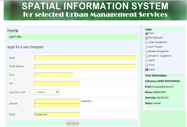 The screenshot in Figure 18 shows web page for dumpster application by the user. The screenshot in Figure 19 shows mapping of the land transport facilities in an area while that in Figure 20 shows an area with disaster occurrence.