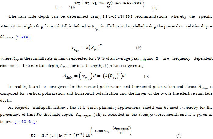 where f is frequency of the emitted signal in GHz and d is the length of the link in km. Also, in wireless link design, for any given fade margin (fms) and receiver sensitivity (Ps), the received signal (PR) is given as: