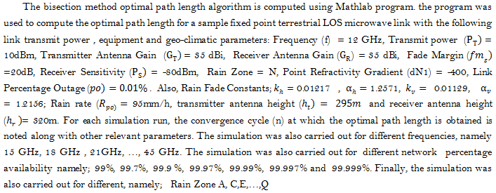 In all, the bisection method can be used to determine the optimal path length of terrestrial microwave link. However, the convergence cycle of the algorithm is affected by various link parameters.