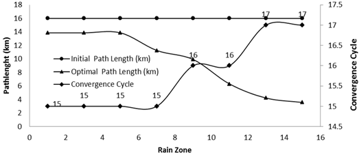 Figure-7. Bisection Method: Initial Path Length, Optimal Path Length and Convergence Cycle vs Rain Zone
