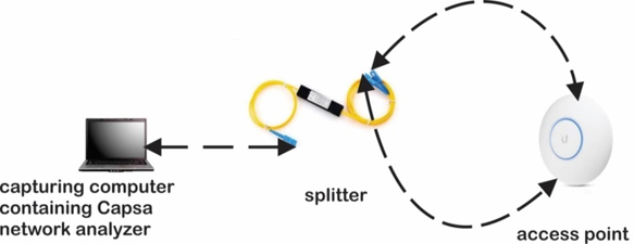 The splitters used were bidirectional splitters to allow data capture as the device is in use. Two separate network cards were used to efficiently monitor the entry of traffic and to leave the network's core network at each access point. The capture device was connected to the University server serving as the passive instrument of assessment. The number of packets (in and out of the network) was assessed and analyzed using the capturing computer (tool). In contrast, the network's one-way delay was estimated by tracking the same individual packet at specific capturing points. There are various assessments within the network for both in- and out traffic. There is one clock in use while capturing the traffic, as shown in Figure 2, this allows reliable time to be obtained between the in and out packets of one device in use.