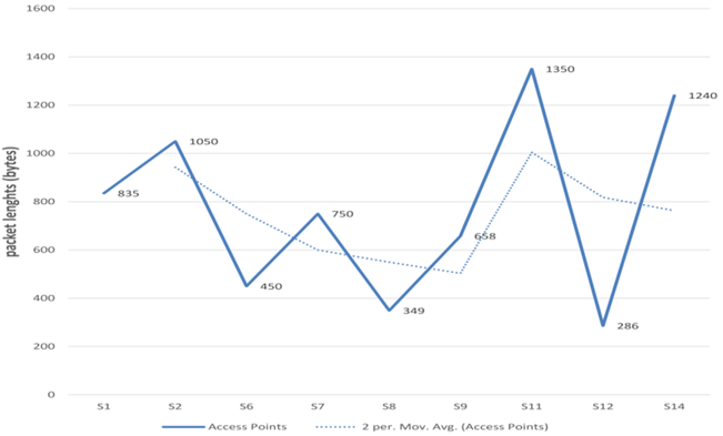 The fragmentation of packets in the network was observed in this study by capturing an established end-to-end file transfer protocol over the core network with large device files to an end-user with a maximum packet size of 1500 bytes. The packet lengths distribution was captured, as shown in Table 6 and Figure 3, respectively, where the delivery is from the core network's traffic towards the users. The results showed that there is no or little fragmentation of the packets during the transfer of data. Across all captured points, the packet length ranged from 286 to 1350 bytes.