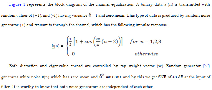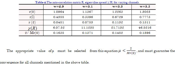 The following table shows the effect of change of the distortion parameter (w) on the elements of autocorrelation matrix (R) and eigenvalue spread.